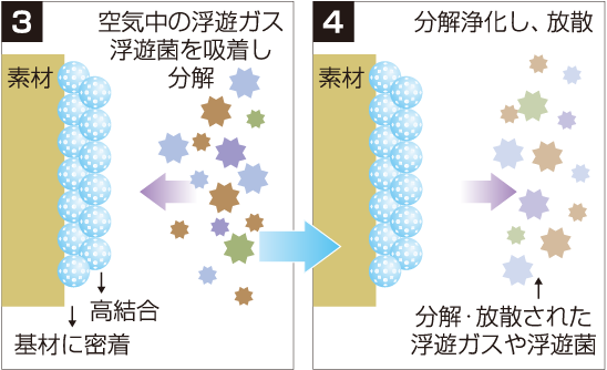 光を必要とせず、空気中に含まれる水分子を取り込む酸化還元作用により、触媒反応を起こすと考えられ、抗ウイルス・抗菌・消臭などの高い効果が期待できます。